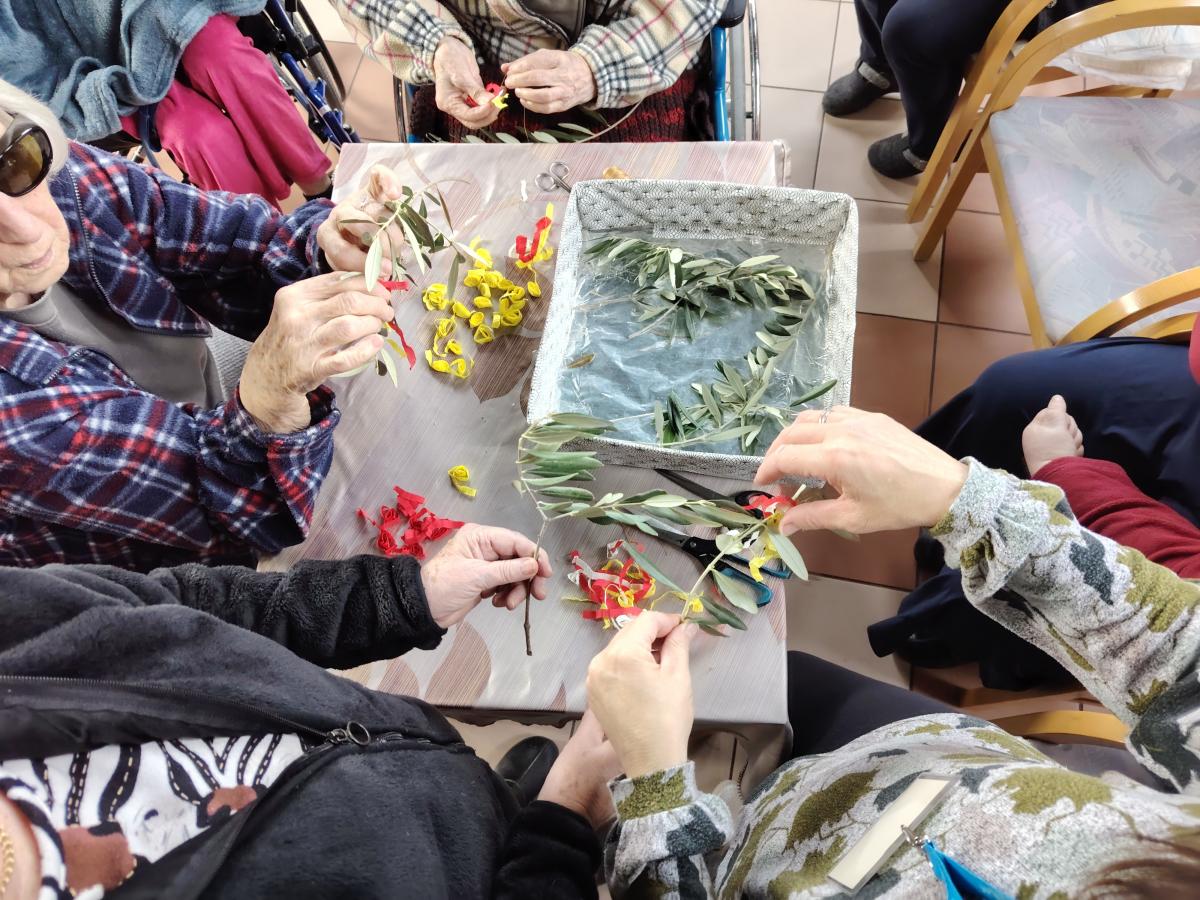 V kapeli so potekale priprave oljčnih vejic za cvetno nedeljo.